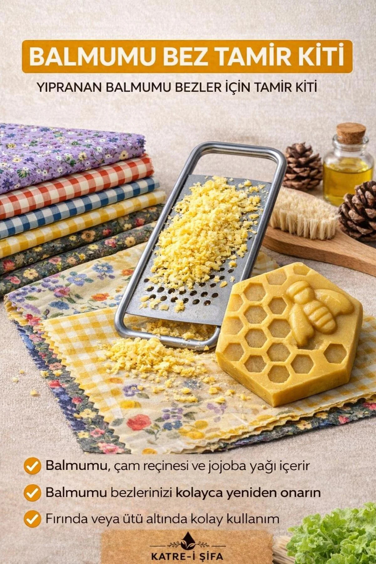 Doğal içeriklerden oluşan Balmumu Bez Tamir Kiti, yıpranan veya özelliğini kaybeden balmumu bezlerinizi ilk günkü haline yakın şekilde yeniden kullanıma hazırlar.