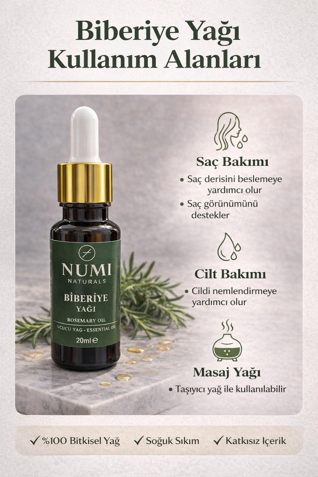 Numi Naturals Biberiye Yağı, biberiye bitkisinden elde edilen doğal uçucu yağdır. Ferahlatıcı ve canlandırıcı aromasıyla aromaterapi, saç bakımı ve cilt bakımında sıklıkla tercih edilir.