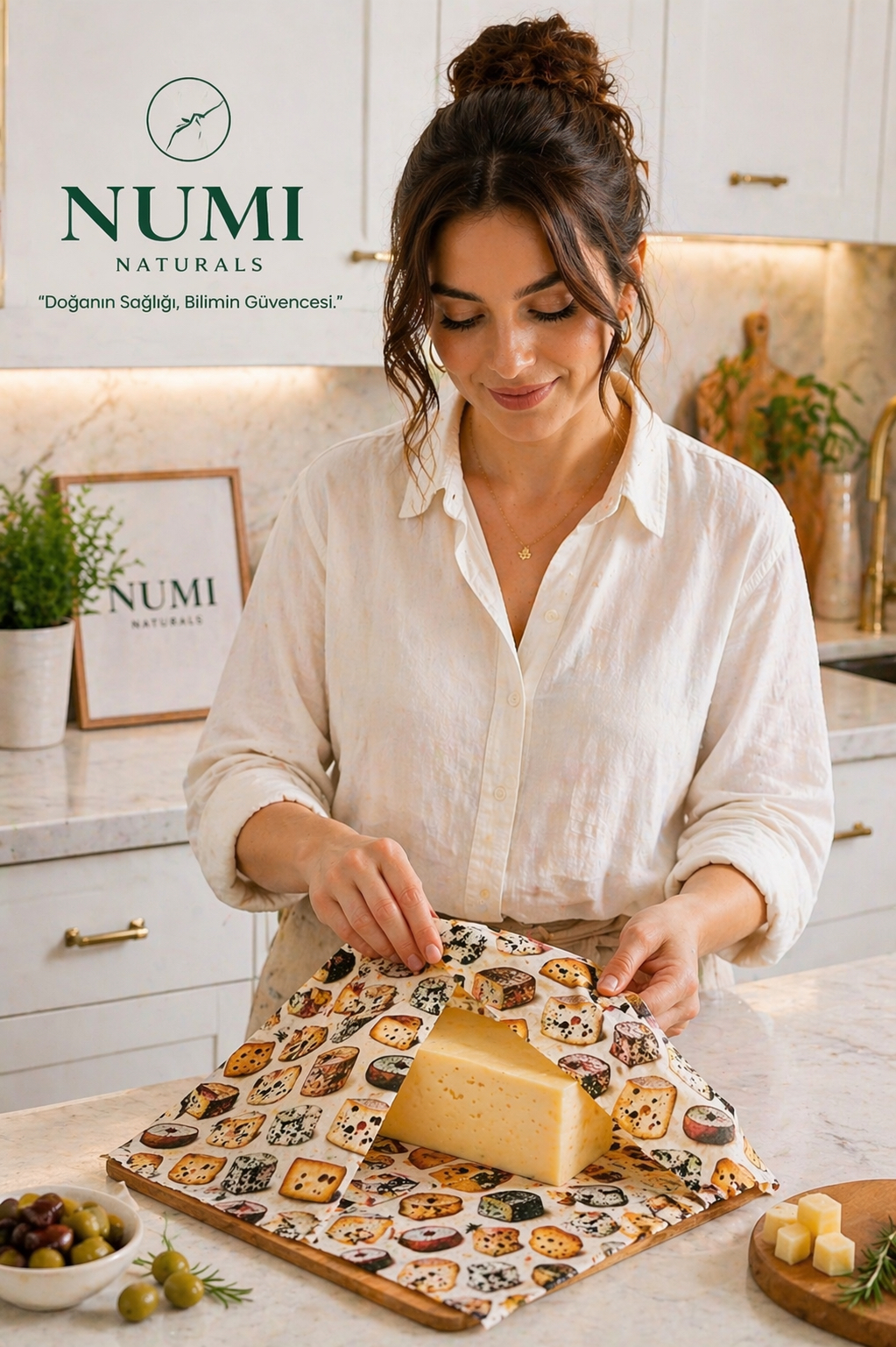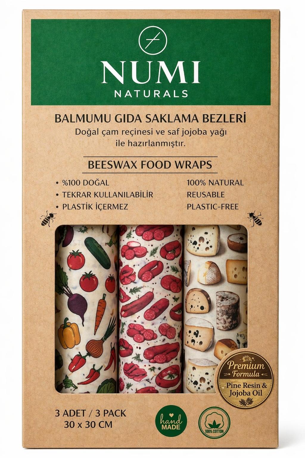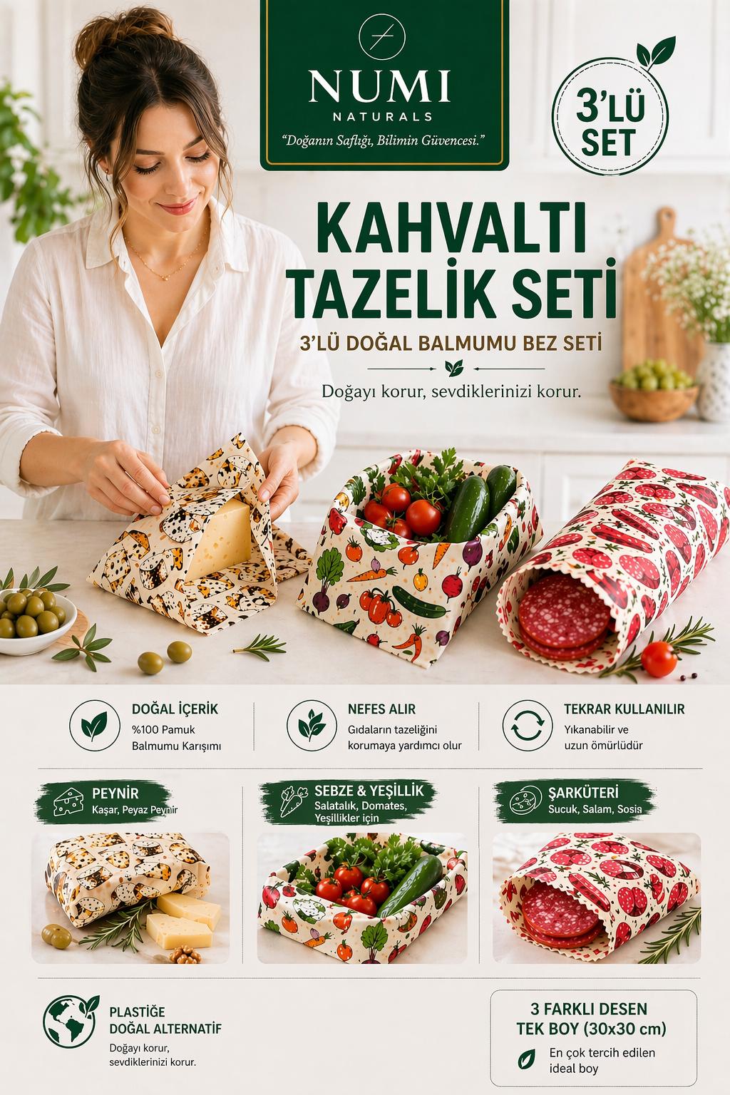 NUMI Naturals Kahvaltı Tazelik Seti – 3’lü Balmumu Gıda Saklama Bezi (30×30 cm)