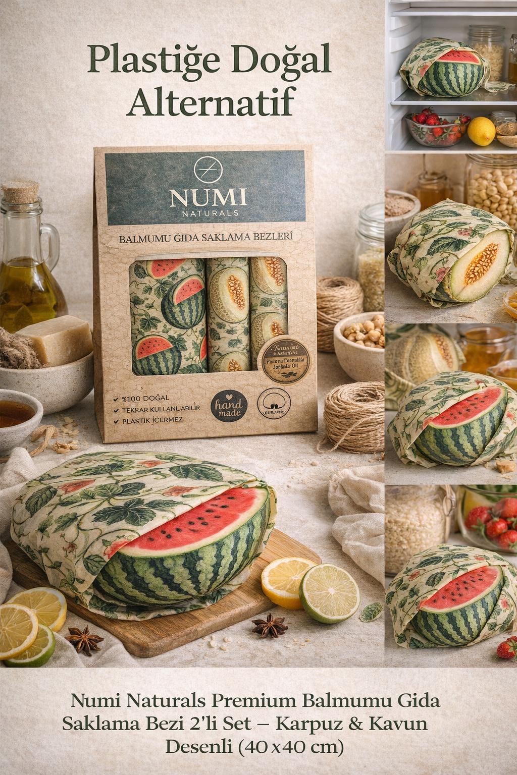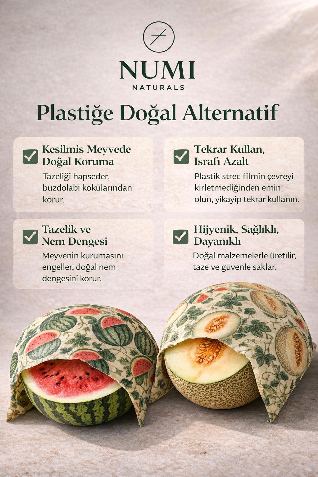 Numi Naturals Premium Balmumu Gıda Saklama Bezi, mutfağınızda plastik kullanımını azaltmak ve yiyeceklerinizi daha doğal şekilde saklamak için tasarlanmıştır. Karpuz ve kavun desenli bu özel 2’li set, hem estetik görünümü hem de fonksiyonel yapısıyla kesilmiş meyvelerinizi daha sağlıklı ve pratik şekilde muhafaza etmenizi sağlar. Doğal balmumu, çam reçinesi ve jojoba yağı ile hazırlanan özel formülü sayesinde bez, gıdalarınızın nefes almasına izin verirken aynı zamanda dış etkenlere karşı koruma sağlar. Böylece kesilmiş meyveleriniz ne kurur ne de fazla nemlenir. Buzdolabında oluşan kokuların yayılmasını önlemeye yardımcı olur ve yiyeceklerinizi daha düzenli bir şekilde saklamanızı sağlar.